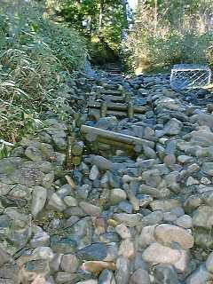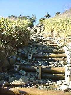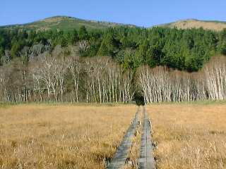 | 2000年11月4日(土) 奥多摩日記番外編 もう冬支度?尾瀬ヶ原〜至仏山 この3連休は、3日は天気は良くないということなので、4日に出かけることにした。 カミさんは数年前に尾瀬沼北岸を、今年8月に尾瀬沼南岸〜燧裏林道と歩いている。今度尾 瀬ヶ原を歩けば尾瀬の全てを歩いたことになる。(私はまだ、燧ガ岳と至仏山が残っていると 思うが・・・) ということで、晩秋の尾瀬に出かけることにした。 3連休の渋滞を避けるため、深夜出発、夜中帰着の予定である。 AM2:00に出発のつもりだったが、良く眠らないうちに目がさめてしまった。前日に用意してお いた荷物を積んでAM1:30出発。 こんな時間でもR16はトラックが多く、結構混んでいる。空いていればこのままR16を行くつも りだったが圈央道にのる。天気予報は晴れだが雲が多く星は見えない。 高速を順調に走り、沼田ICで降りる。片品村に向かう途中のコンビニで昼食を仕入れる。山 の中なのに結構コンビニがある。 尾瀬戸倉を過ぎ鳩待峠へ向かう。ここを通るのは10年ぶりだ。昼間なら紅葉がきれいなのだ ろうが今は何も見えない。11月13日で鳩待・坤六方面は通行止めの看板が出ている。山道を 慎重に登り、AM5:00鳩待峠に到着。 星がきれいだ。満天の星空である。冷たく澄んだ空気が身を切る。エンジンをかけたままの 車のウインドウが曇っている。駐車場に半分ぐらいの車。テントがひとつ。 外はまだ真っ暗なので、車で仮眠する。そうするうちにも続々と車が入ってくる。うとうとするも 寒くて、AM6:00車から出て朝食の支度をする。もうすっかり明るくなっている。レトルトのハッシ ュドビーフと家からランチジャーで持って来たご飯。ポットに入ったコーヒー。 ![]() さすがに11月の尾瀬は寒い。木道にも霜が降りている。下りなので滑らないように慎重に降 りる。1時間ほどで山ノ鼻に到着。テント箔の人が朝食を食べている。 ビジターセンターのトイレによる。今日の午前中一杯で閉めるそうだ。ビジターセンターも今 日で閉めると書いてある。尾瀬の山小屋は、竜宮小屋が10月一杯で、長蔵小屋が11月5日で 閉まるとのことだが、ビジターセンターも今日までだったか。 朝日を背に受けて尾瀬ヶ原を歩く。すばらしく天気が良い。最初の橋に差し掛かる手前で5〜 6人の一団が追い越していく。最後の人が言う。 「尾瀬は今日で山を閉める。かかっている4本の橋は全て板をはずすので帰りには橋がなく なるよ。牛首くらいまでは行けるかな。8時半にビジターセンターから第2陣が出てこの橋から 落としていくんだ。」 どおりで歩いている人が少ないわけだ。まだ30分ほどある。さてどうしよう。 その1 山ノ鼻〜竜宮小屋〜富士見峠〜鳩待峠 約6時間 その2 山ノ鼻〜至仏山〜鳩待峠 約4時間半 ガイドブックにはそう書いてある。以前は至仏山〜山ノ鼻は登山禁止だった。登山道が荒れ て高山植物を痛めるからだ。このルートは歩いたことがない。至仏に登るか。 ![]() 燧ガ岳? 山ノ鼻まで引き返し、至仏山登山口へ向かう。AM8:30整備された登山道を登る。山頂までほ ぼ直登のルートだ。(9時以降入山禁止とある) ![]() 滑りやすい木の階段をひたすら登る。まわりは木に覆われ眺望はない。傾斜は結構きつい。 所々水が流れている。だんだんと崩れた岩が転がっているようになり、荒れてくる。 ついにはとんでもないところに出てしまった。岩が道を覆い尽くしている。ガレ場というにはあ まりにもだ。 ![]() ガイドブックは2000年5月初版のものだが、夏の間にやられてしまったのだろう。水がかな り流れている。予定よりだいぶ時間がかかりそうだ。 滑りやすい岩がゴロゴロした道を登っていくと森林限界が見えた。景色も開けてくるだろう。 ![]() 日が当たるようになりだいぶ暑くなってきた。ここまで1時間。すでにジャケットは脱いでいた が、ラグビージャージ1枚にする。足場は相変わらず悪い。 ![]() だいぶ景色が良くなってきた。とともに、山から下ってくる人がだいぶ増えてきた。すでに10 時を回っている。もうすぐ中間点だよ!と声をかけられる。だいぶバテてきたか。 ![]() 中間点からの眺め この付近はガレているというより、完全に岩場だ。鎖もある。所々にある階段もボロボロだ。 ここまで約1時間半。ということは登り約3時間か。ガイドブックでは2時間半となっていた。まあ 時間はたっぷりある。カミさんもだいぶつかれているので、大休止。 しばらく登ると階段が新しくなってくる。これは楽だ。だいぶはかどる。本来こんなペースなん だろう。途中階段を作りつける作業をしているところに出会った。ヘリで材木を運び、ここで現 地の形あわせて切っている。作業をしている人たちは、毎日ここまで登ってくるのだろうか。本 当にご苦労様です! ここからは延々と階段が続くようになる。まるで天国への階段! ![]() だいぶすれ違う人も多くなる。中には本当のこの先降りるの?という感じの年配者もいる。ガ イドブックを見ても登山道は整備された
