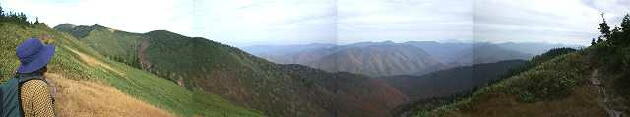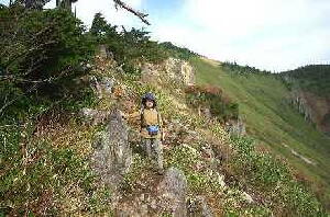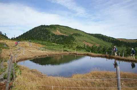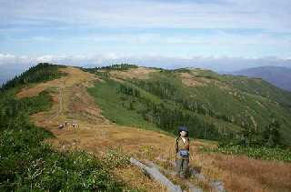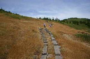 | 2001年10月13〜15日 檜枝岐・紅葉トレッキング 今年のカミさんの念願であった連泊旅行は、紆余曲折の末「檜枝岐キャンプ」となっ た。本当は京都に2泊3日ぐらいで紅葉を見に行きたかったようだが、尾瀬も歩きたいな どと無理をいわれてはどうしようもない。今回のメインは「会津駒ヶ岳」である。 いつものように深夜に出発して駐車場泊するのはやめて(もう寒いからね)、朝5時 過ぎに出発。関越道小出ICから銀山湖経由で尾瀬御池駐車場をめざす。10月に入って 湯之谷村銀山平はようやく紅葉が始まったところのようだ。前夜の雨が上がったばかり で、時折薄日が差すものの紅葉がいまいち映えない。県境を越えたあたりからようやく 日が差し、良い感じになってきた。 ![]() まだチョット青々しているかな… 雨雲の中から時折日がさす尾瀬沼 今日は温泉&キャンプメインなので尾瀬沼は周辺散策のみだ。もう尾瀬は麦秋の雰囲気 で観光客もそれほど多くはない。天気はまた雲が多くなって風も冷たい。小屋の売店で 休憩。大福を売っていた。どうやって作ってるのかな?お腹もすいたので長蔵小屋でラ ーメンを食べた。すぐ出来ますといわれたので出てきたのを見たら、いわゆる生タイプ 麺のラーメンのようだ。茹でなくて良いので排水の減量になるのだろう。先ほどの大福 も冷凍(冷蔵)と思われる段ボールから出されていた。一から作るわけではないのだ。 いろいろ便利になったが、こうしなければできないのだ。 尾瀬を後にし今夜のねぐらへ。キリンテのキャンプ場はガラガラでどこでもテントが 張れるが、夏にもお世話になった「かわばたキャンプ場」にした。管理人は夕方にしか 来ないので、好きなところにテントを張る。今回はミニタープも張った。そうこうする うちに管理人さんが軽トラックに乗って登場。数年前まで八王子にいらして、ご主人の 実家にUターンしてきたというおばさんだ。今回もいろいろ世間話をしているうちに、 今夜は冷えそうだからとオイル缶のかまどと毛布を貸してくれる(もちろんタダで)と いうことで、ありがたくお借りした。温泉で暖まってから、焚き火にあたりながら夕飯 の支度をする。といっても、トン汁とご飯だが。ご飯は明日食べるお握りの分も炊く。 お酒を3合ほどいったところで眠くなったのでお仕舞い。 翌朝はやや寝坊してしまって6時過ぎに起きた。手早く支度を済ませたつもりだが出 発は7時過ぎになってしまった。今日は登山口から登って駒の小屋についた後、会津駒 ヶ岳周辺散策、その後大津岐峠に向かい、キリンテに下りる予定だ。登山口そばのテニ スコート前の駐車場に車を止め、登山口まで歩く。登山口からは舗装林道が延びていて 終点手前に会津駒ヶ岳への登り口があるのだが、多分車で一杯だろう。7時20分、登山 口にあるトイレで朝の支度を済ませ、紅葉のきれいな渓流沿いに登りだす。途中林道を それ九十九折れの道を登っていくと、さっきの林道と合流する。林道には所狭しと車が 駐車していて、すれ違いもできそうにない。車の列を眺めながらしばらく登ると登り口 の階段である。ここで皆さん登山届などを書いているので、つられて書いてみたが、ポ ストは満杯であった。今日も沢山の人が登っているのだろう。(7時45分) ![]() ウ〜ン、入らない やっと赤い葉っぱが目立ってきました な登り坂が続く。かなり続く。中間点にあたる水場で一休み。(9時10分)まだ半分 か、とやや気持ちがなえる。続々とハイカーが登ってくるので先を急ぐ。ここからの九 十九折れの登りは時折眺望の良いところもあるが基本的に茅の中である。おまけにぬか るんでいる。すれ違いもままならないほど細く深くえぐれているところもある。下って くるハイカーに声をかけられながらあえいでいると急に展望が開けた。会津駒ヶ岳を正 面に見る展望台である。ここまで来ればもう一息。木道に沿って歩くとさっきとは反対 方向に燧岳が見える。正面には駒の荘へと続く木道が延びている。 ![]() ぱっと開けた所に燧岳が見える チョット長いががんばって登る 10時55分山荘着。駒の荘にはすでに多くのハイカーが休憩しており落ち着かないが、 池のむこうにつづく会津駒を眺めているとゆったりとした気分になれる。一息いれたあ と山頂をめざす。急な階段状の木道を登ると山頂だ。小屋から20分。山頂は狭く眺望も ないのですぐに中門岳方向に下る。同じように階段状の木道を下ると、馬の背のように なだらかな尾根が続いているのが見える。皆このやさしい景色を見にくるのだろう。木 道を下ったところのベンチで昼食を済ませ、少し周辺散策する。中門岳までは近そうに 見えても結構距離があるし、基本的に同じ景色が続いているので、途中でおり返すこと にした。 ![]() ここまで来た甲斐がありました ![]() 山頂にはこれだけ ずーっと続く馬の背のような山 再び山荘に戻り富士見林道に向かう。(12:40)富士見林道は駒の小屋から大津岐峠 に続く尾根沿い