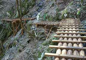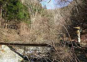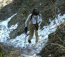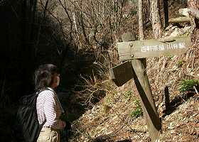 | 2002年3月10日(日) 春まだ遠き−川苔山 このところ暖かい日が続いているので、奥多摩の雪もだいぶ解けただろうと川苔山に 出かけた。 高水山から棒ノ折までは全山走破したので、厳密には続いていないが次の 目標である。 川井から大丹波川沿いに車で上っていく。百軒茶屋を過ぎると大丹波 林道になる。いつもなら通 行止めの看板が立っているところに駐車スペースがあり、 ここが登山の出発点だ。身支度を済ませ た時点で時刻は9時45分になろうとしてい る。やや出遅れたか。 ![]() まずは下の渓流まで急な道を下る。すべりやすいので注意。川の右岸、急な斜面につ けられた道 を登っていく。目の前には清らかな流れ。暑い時期なら気持ちよさそう だ。 ![]() いくつか橋を渡り30分ほど歩くと「百軒茶屋・川井」方向とかかれた案内板があ る。ここの分 岐を登ると大丹波林道に出られる。ここから暫く谷が広くなっていて、 散歩道のようなのどかさだ。 ![]() のどかさもつかの間、道は高度を上げ、深い谷底を見下ろすようになる。良くこんな ところに道 をつけたと思ったら、桟道というのだろうか、ほとんど空中を歩くかのよ うだ。 ![]() 怖い思いをやり過ごすと、道は林間に入り一安心。そろそろ山葵田が見えるはずだと 思っている と遠くに白いものが・・・雪が少し残っている。いや〜な予感。しっかり 残っているところもあっ てカミさんは一苦労。軽アイゼン買ってやればよかった。 ![]() 山葵田を過ぎると谷が二手に分かれているが、ここは右に向かう。相変わらずの雪に 悩まされな がら行くとようやく獅子口小屋跡だ。11時15分。ここで小休止。 ここからは急な斜面のつづら折れになるが、雪のため思うようにはかどらない。最後 に植林の急 斜面を登ると踊平だ。小屋跡から30分ほどのはずが40分かかった。 ここから尾根沿いに道が続いている。さしたるアップダウンもなく、うららかな日差 しを浴びて 気分が良い。遠く富士山も見える。名栗方面に目をやれば尾根ちかくを林 道が通っているのも見える。 ![]() さあ、ここまでくれば山頂はもうすぐ、あれを越えれば、次を越えればきっと、と進 むがいつま でたっても着かない。標高が上がっているので完全に雪道になったのと、 12時を過ぎ、お腹が空 いているので気ばかりあせっている。 ![]() 12時45分、ようやく見覚えのある小屋が見えてきた。(今頃思い出すなって!前 に来たとき はここでおでんを食べて、結局山頂には登らなかったんだよな)ここで小 休止し、勢いをつけて山 頂を目指す。12時55分山頂着。(1360メートル) ![]() 結構広い山頂には人がいっぱい。少し戻った雑木林の中でお昼にした。お腹がふくれ ると昼寝し たくなるような陽気である。近くに思えるが結構時間のかかる山である。 川乗林道が使えればあっ という間だろうが、それはそれでつまらないか?根っこが生 える前に下山することにした。 下山コースであるが、踊平には川乗林道から分岐している日向沢林道が直下をトンネ ルで通って いる。これが大丹波林道に繋がったと思い込んで、林道に降りようとして いたら、下から上がって くる人がいる。聞いてみると、同じように考えて林道を歩い ていったら道が途切れていて、引き返 してきたとのこと。まだどこかに抜けているわ けではないのか。残念。 |